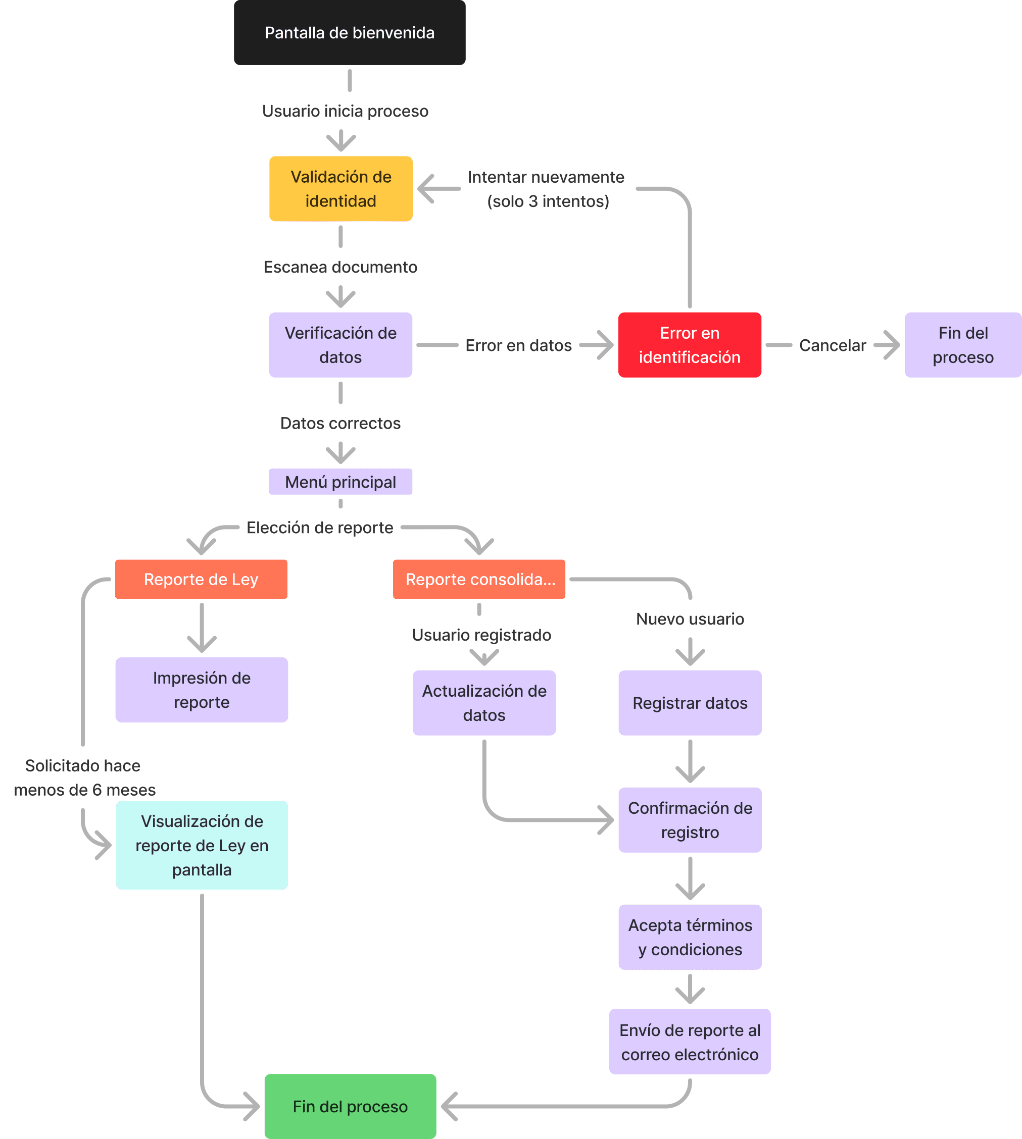 Para estructurar el proceso, mapeé los diferentes casos de uso en un flujo de trabajo. Este análisis fue clave para identificar los posibles puntos de fricción y optimizar la experiencia del usuario al interactuar con los quioscos.